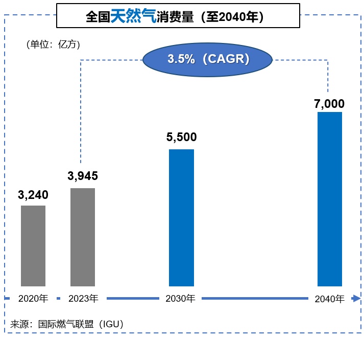 展望未来,国际燃气联盟(IGU)数据显示,中国天然气的消费峰值预计出现在2040年,天然气使用量将增加至约7000亿方,复合年均增长率约3.5%。