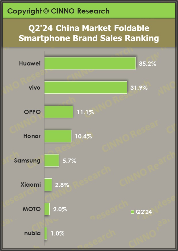 从市场份额来看,2024年第二季度,华为位居国内市场份额No.1,份额同比上升1个百分点;vivo则位居第二,主流品牌市场份额增长最大,主要贡献来自于其3月上市的新机X Fold3/ X Fold3 Pro;OPPO排名国内第三,份额同比下滑5个百分点,主要因其新机上市周期延长。