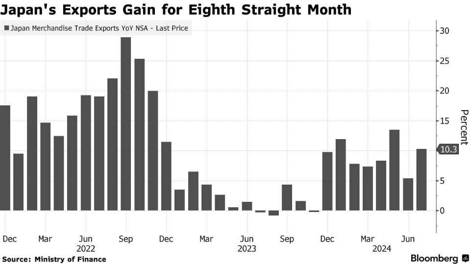 7月份,日元对美元的平均汇率为159.77,同比下跌了12.3%,这一汇率的下跌支撑了出口额的增长。然而,从出口量来看,实际上出口额同比下滑了5.2%。此外,数据还揭示了汽车出口的复苏迹象,尽管今年早些时候该行业曾受到安全认证丑闻的重创。