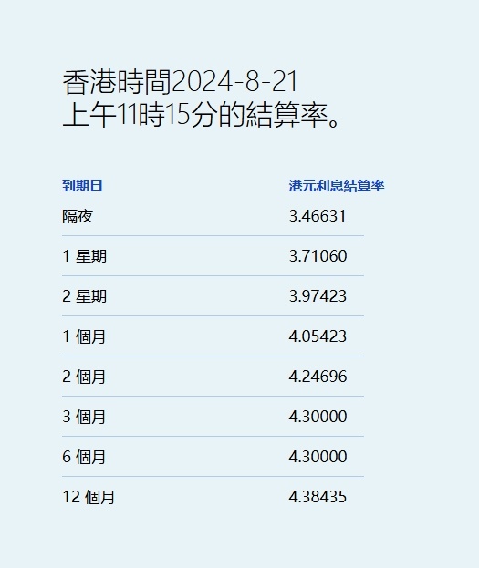 智通财经APP获悉,8月21日,港元拆息持续偏软,隔夜息再跌4基点至3.46631%,续创5月7日以来新低,而与楼按相关的一个月拆息亦四连跌,报4.05423%,见一周低位。