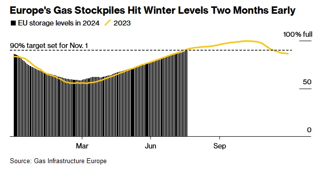 今年夏季,市场对供应中断十分敏感,这导致欧洲天然气价格出现较大波动。本月早些时候,在乌克兰与俄罗斯在靠近关键天然气中转站的库尔斯克地区发生冲突之后,对供应中断的担忧推高了欧洲天然气价格。目前欧洲大陆充足的天然气库存有助于抵消供应风险。尽管天然气储备率较去年同期略有下降,但仍远高于五年平均水平。