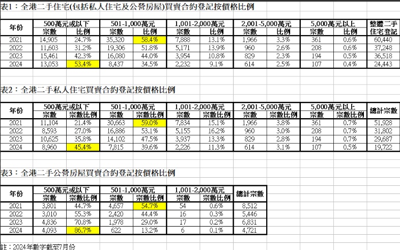 杨明仪提到,在香港二手私人住宅及二手公营房屋中,2024年首7个月同样以500万港元或以下的买卖比例升幅最大,分别录45.4%及86.7%,比2023年的35.8%及70.8%,增加9.6及15.9个百分点,亦较2021年的21.4%及44.7%,累升24及42个百分点。2021年原本有近六成私楼及五成半公营房屋买卖为501万-1000万港元的成交,但今年私楼及公营房屋占比最高的类别已经变为500万港元或以下的低价成交。