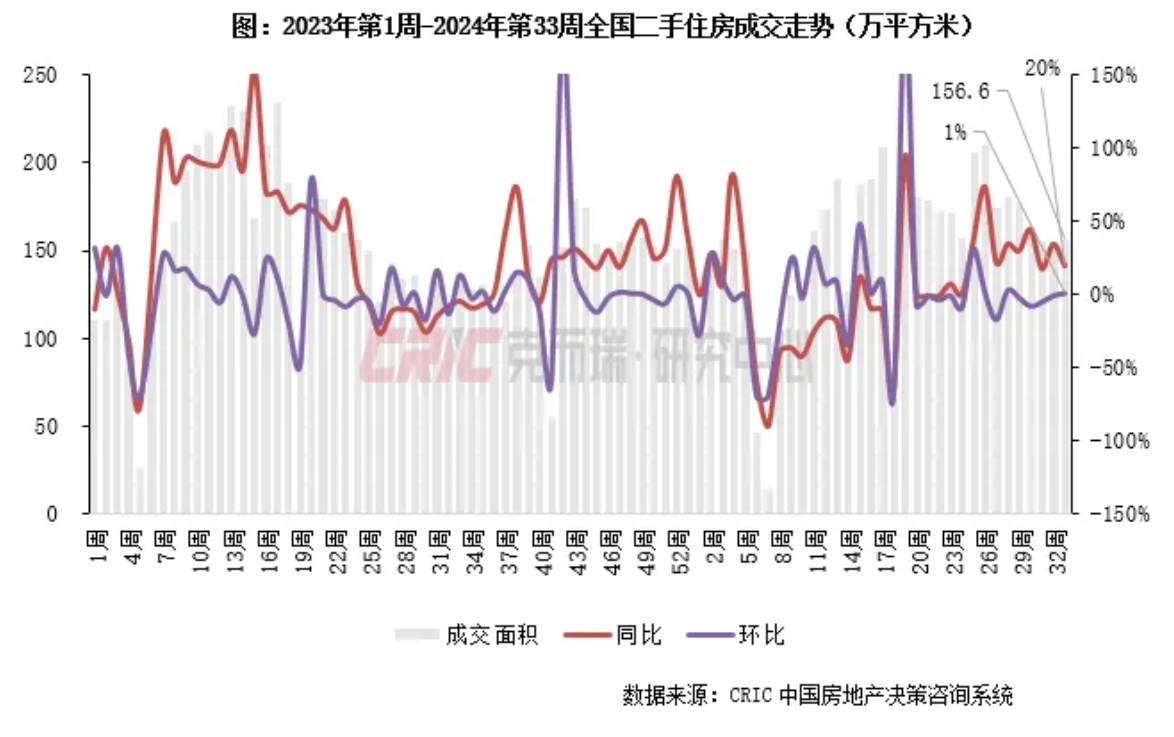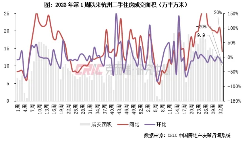2024年第33周,杭州二手住房成交面积9.9万平方米,环比下降20%,同比增长20%,较周平均下降22%。