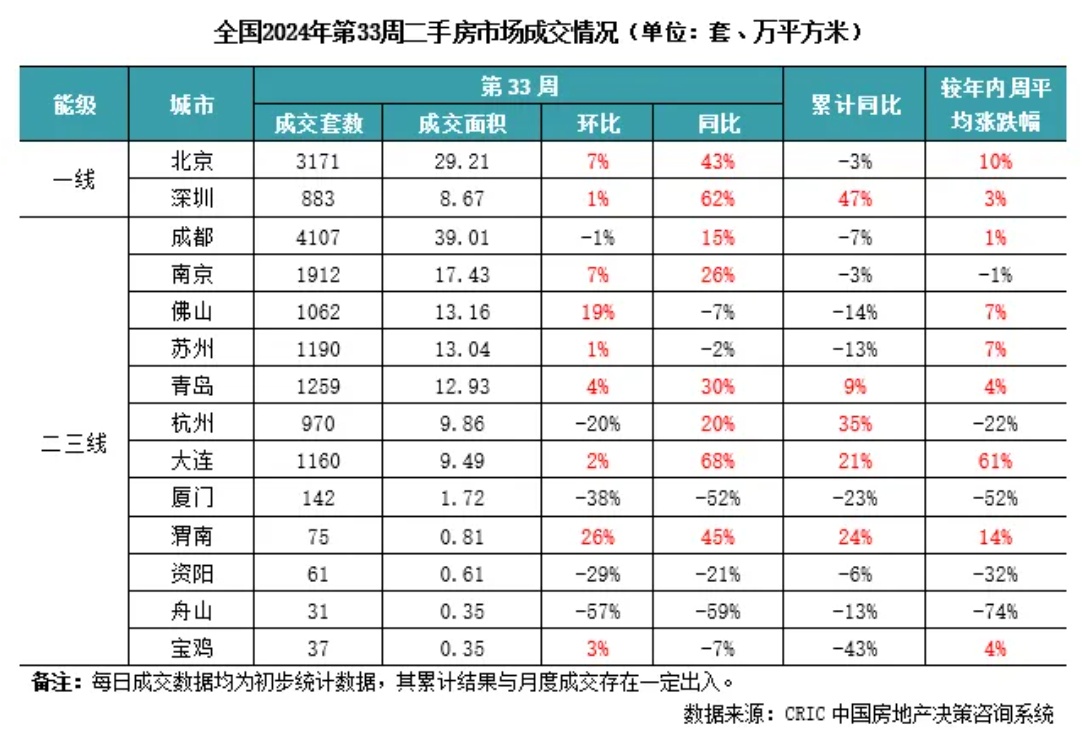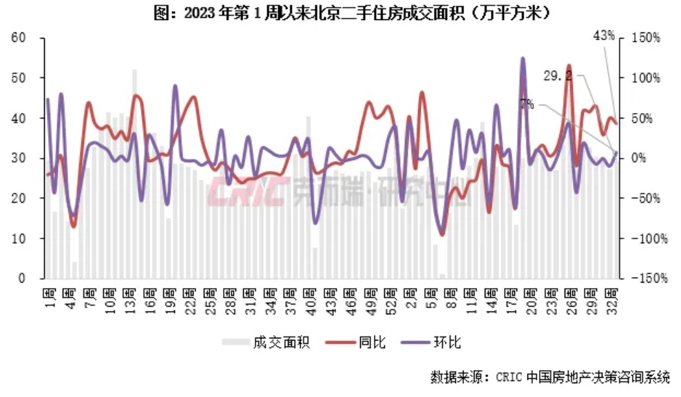 2024年第33周,北京二手房成交面积29.2万平方米,环比增长7%,同比增长43%,较周平均增长10%。
