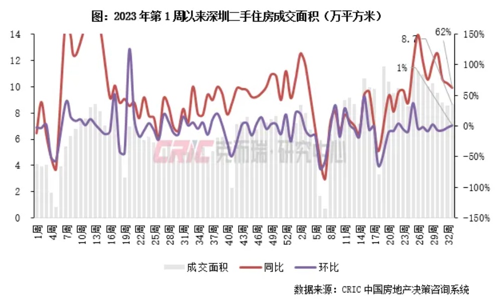 2024年第33周,深圳二手房成交面积8.7万平方米,环比增长1%,同比增长62%,较周平均增长3%。