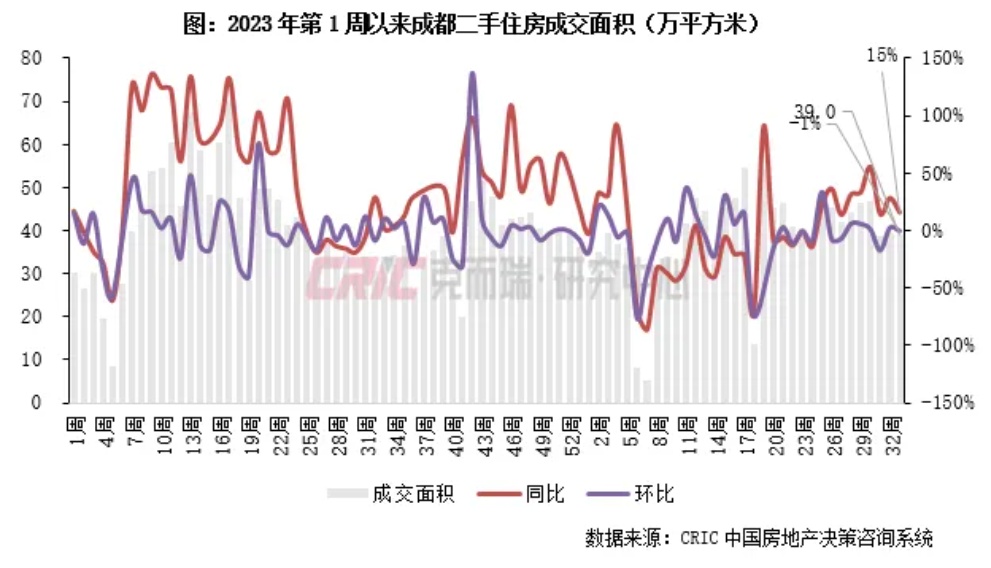 2024年第33周,成都二手住房成交面积39.0万平方米,环比下降1%,同比增长15%,较周均值增长1%。