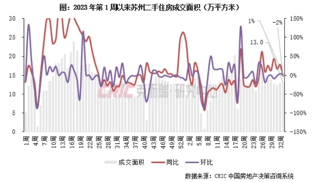 2024年第33周,苏州二手住房成交面积13.0万平方米,环比增长1%,同比下降2%,较周平均增长7%。