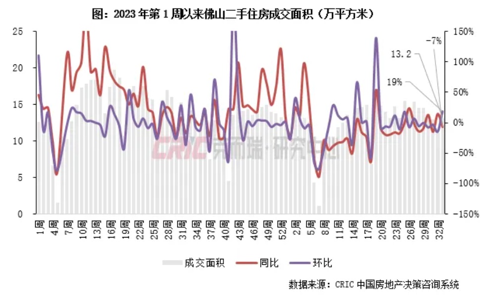 2024年第33周,佛山二手住房成交面积13.2万平方米,环比增长19%,同比下降7%,较年内周平均增长7%。