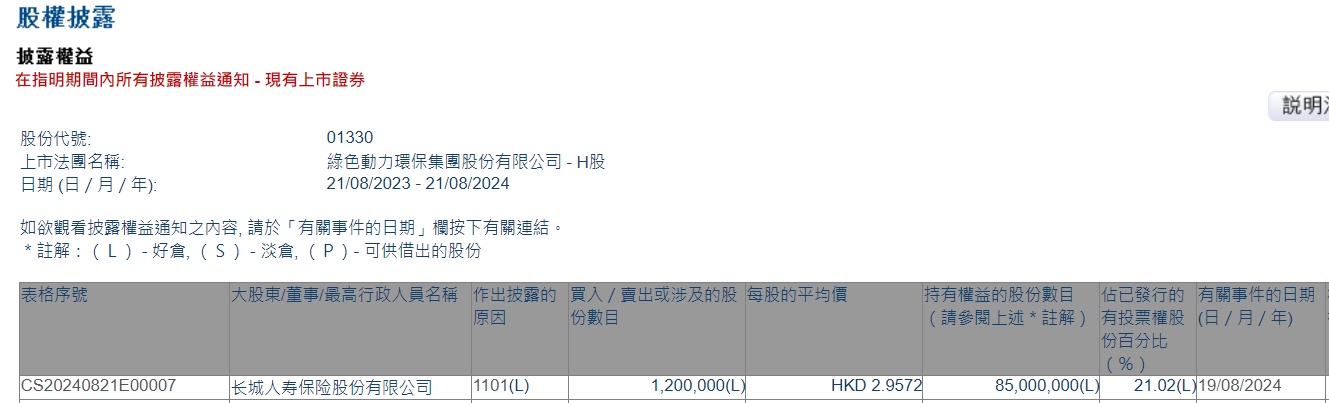 智通财经APP获悉,香港联交所最新资料显示,8月19日,长城人寿保险股份有限公司增持绿色动力环保(01330)120万股,每股作价2.9572港元,总金额为354.864万港元。增持后最新持股数目为8500万股,最新持股比例为21.02%。
