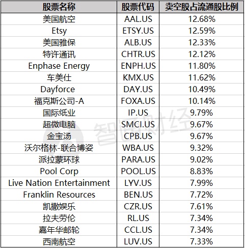 Etsy在7月底被卖空的股票数量也有所减少,占其流通股的12.59%。美国雅保在7月底有12.33%的股票被卖空,同样较6月底有所减少。