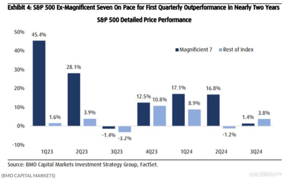 自第三季度开始以来,这些超大型公司的股价表现落后于标普500指数中的其他493家公司。据BMO首席投资策略师Brian Belski称,这意味着这些巨头股票可能会在近两年内首次在一个季度内表现不如标普500指数的其他股票。