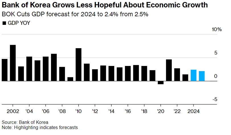 韩国央行对经济增长的预期下修——韩国央行将2024年GDP预测从2.5%下调至2.4%