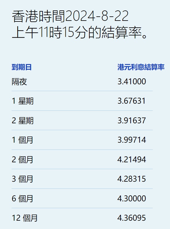 反映银行资金成本的三个月拆息微跌至4.28315%,六个月拆息维持4.3%,一年期则跌至4.36095%。