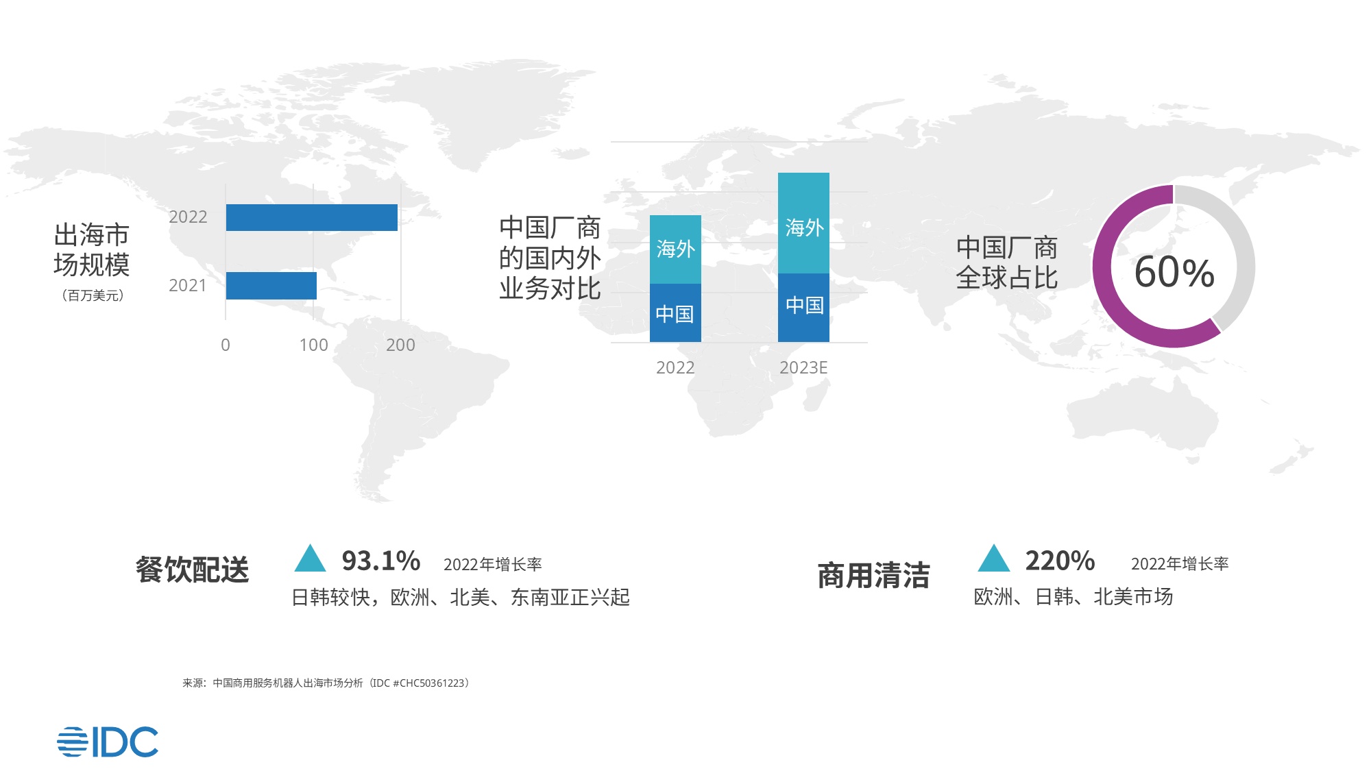 随着在国内市场的验证和推广,中国商用服务机器人厂商积极拓展海外市场并获得迅猛增长。中国商用服务机器人厂商2022年海外收入占比已超50%。目前,IDC正在进行2023年机器人出海市场研究,预计中国厂商的海外收入到2023年有望增加至六成,海外业务已经成为中国厂商的重要业务增长点。整体来看,中国商用服务机器人厂商在全球市场份额占比超60%,已取得了主导地位。