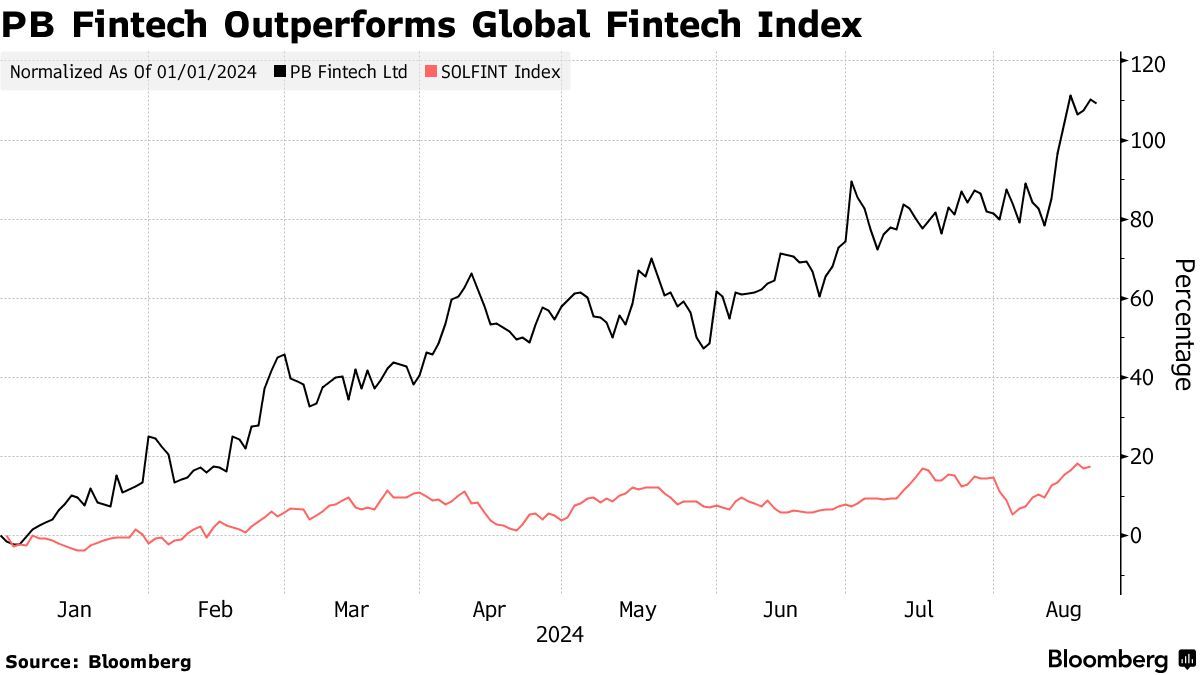 智通财经APP获悉,随着印度无担保贷款市场出现复苏迹象,PB Fintech Ltd.股价飙升,使其成为今年全球主要金融科技公司中表现最好的股票。数据显示,该股股价今年迄今上涨了约110%,是Solactive金融科技指数中市值低于10亿美元的公司中股价涨幅最大的。相比之下,该指数今年以来上涨15%,最大成分股为Intuit(INTU.US)和费哲金融服务(FI.US)。
