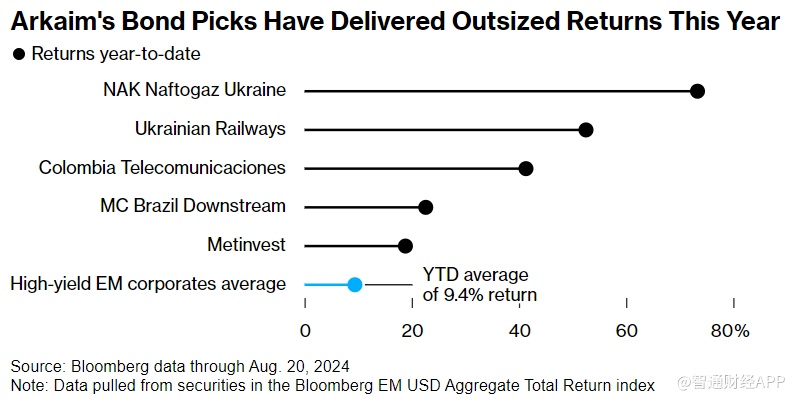 该基金持有国有企业乌克兰国家天然气公司和乌克兰铁路公司以及矿业公司Metinvest的债券。这些债券今年的回报率是新兴市场中最高的,分别为73%、52%和19%,而垃圾级债券的平均回报率为9.4%。