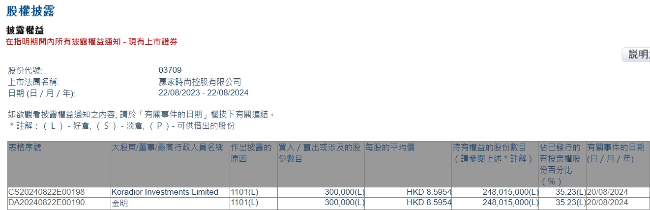 Limited增持赢家时尚(03709)30万股,每股作价8.5954港元,总金额为257.862万港元。增持后最新持股数目约为2.48亿股,最新持股比例为35.23%。