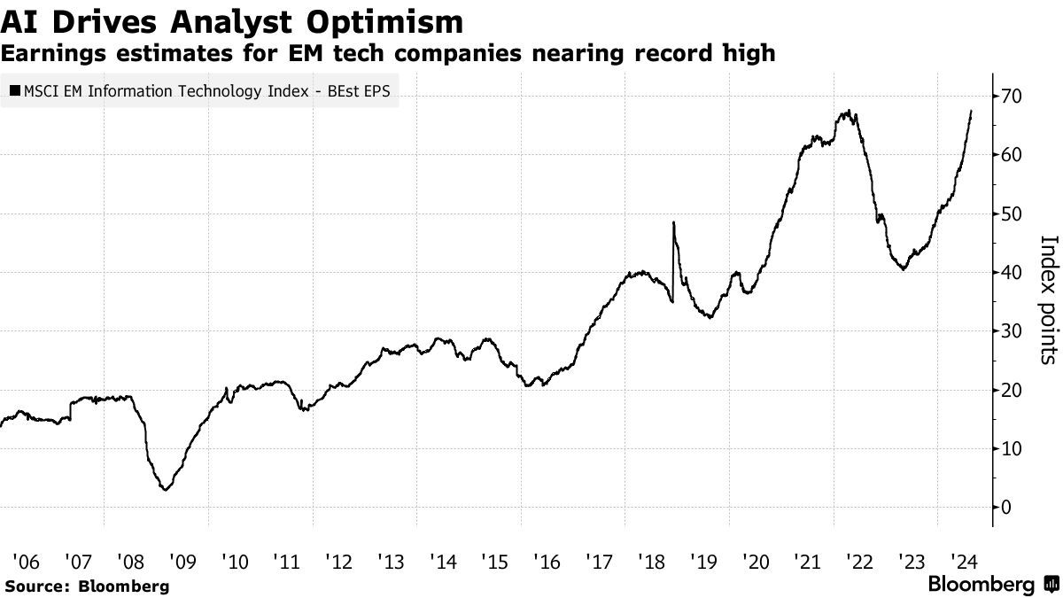 就分析师而言,他们正在提高对新兴市场企业盈利的预测,因为人们越来越预期美联储的宽松政策将支持新兴市场降息。分析师对科技公司的普遍利润预期接近历史高点。与美国类似,对人工智能的兴奋情绪支撑了新兴市场股市今年以来的上涨。但也有人担心,该行业预期的财务表现可能不会很快实现。投资者正在等待备受关注的英伟达(NVDA.US)即将于下周公布的最新业绩,以判断该行业的涨势能否持续。