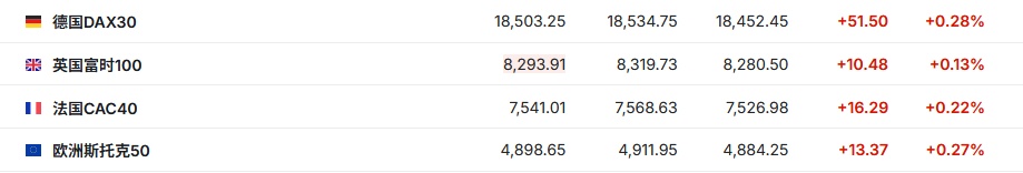 2. 截至发稿,德国DAX指数涨0.28%,英国富时100指数涨0.13%,法国CAC40指数涨0.22%,欧洲斯托克50指数涨0.27%。