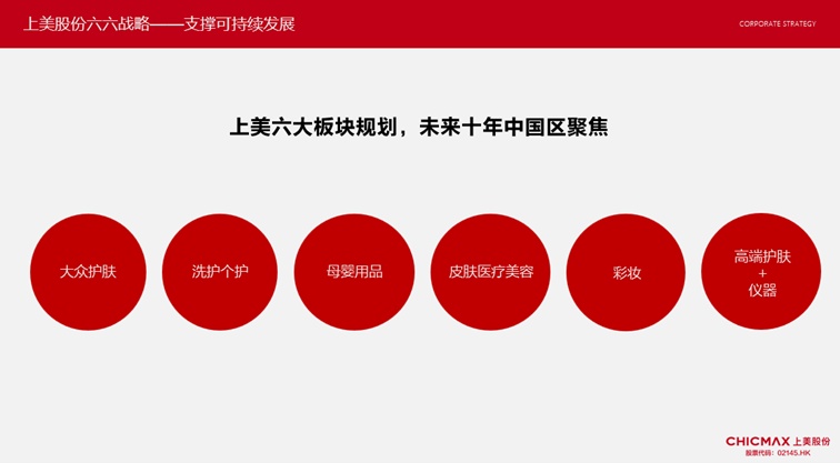 未来10年,公司在国内市场将聚焦大众护肤、洗护个护、母婴用品、皮肤医疗美容、彩妆、高端护肤+仪器六大板块,满足多元化消费需求,激发各品牌的高潜力和高势能,支撑公司长远、健康、可持续发展。