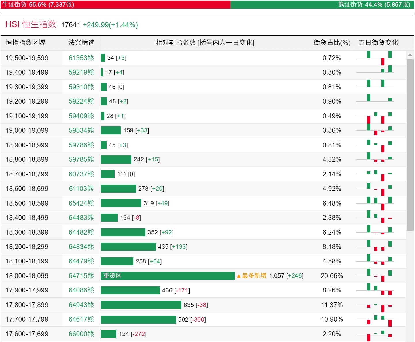 法兴恒指牛熊证街货分布图中的数据显示,熊证街货重货区和最多新增都在18000-18099区间,该区间最新熊证数量为1057张,较上一交易日增加246张。