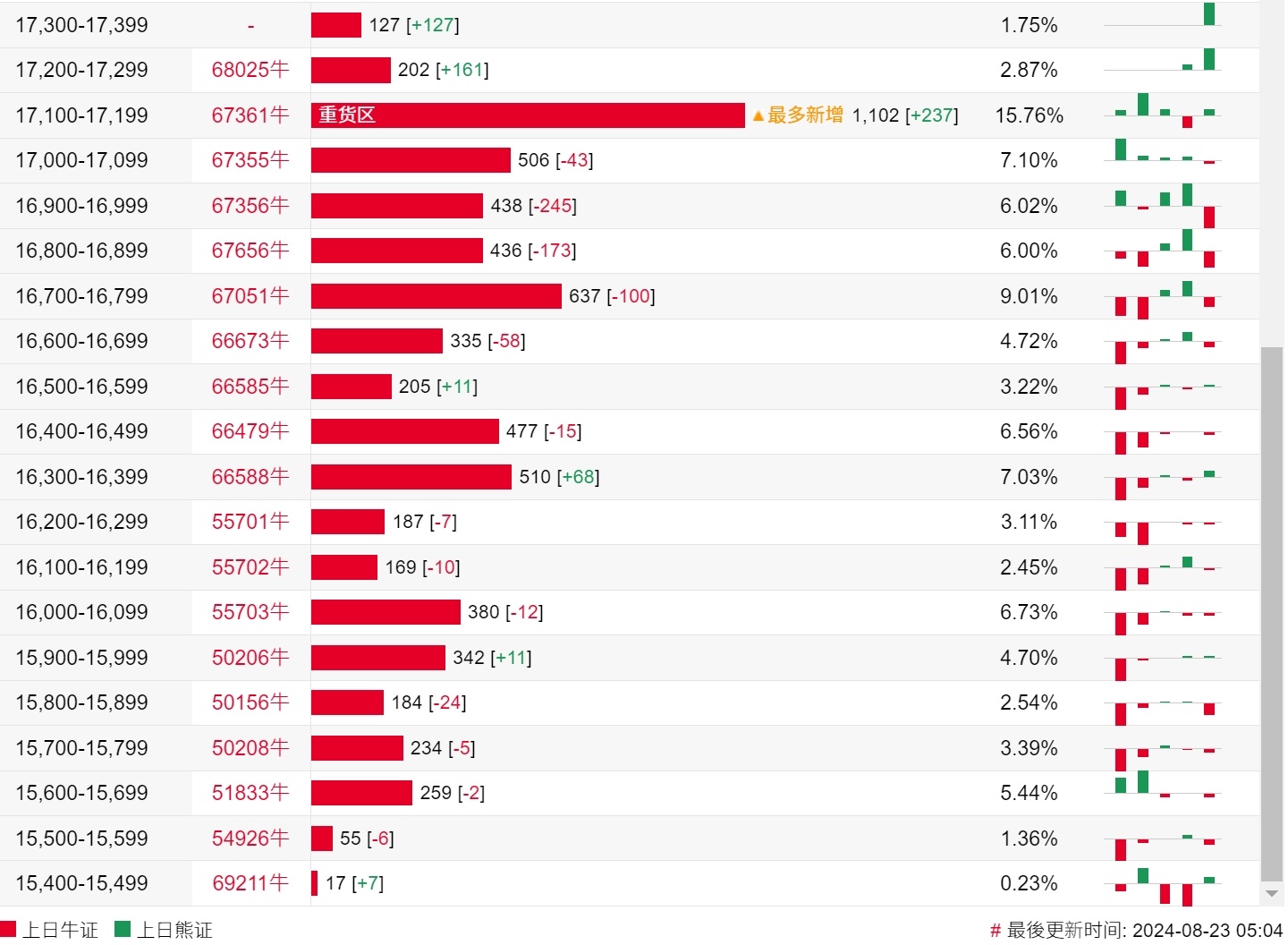 牛证街货重货区和最多新增都在17100-17199区间,该区间最新牛证数量为1102张,较上一交易日增加237张。