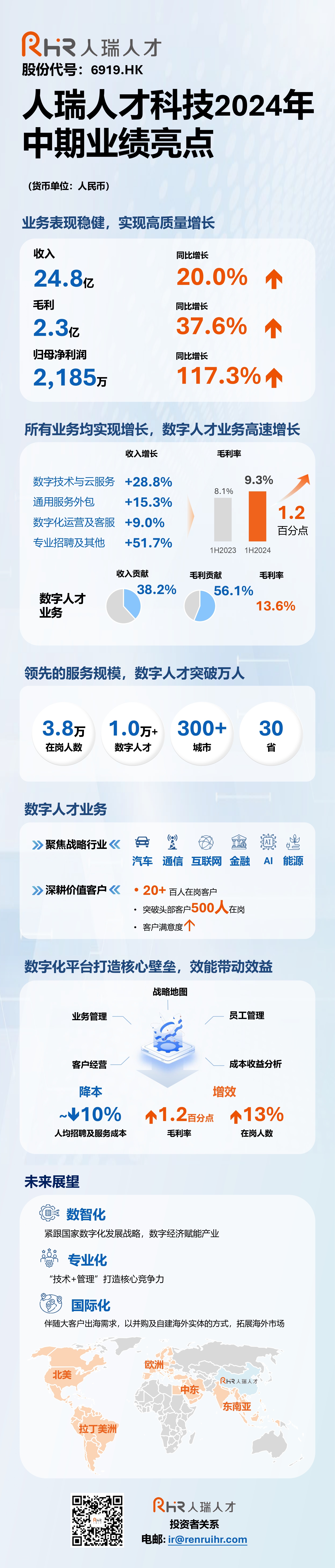 智通财经APP获悉,人瑞人才(06919)公布2024年中期业绩,上半年公司实现收入24.8亿元,同比增长20%;实现毛利2.3亿元,同比增长37.6%。上半年,公司实现稳健增长,主要得益于各个业务板块的收入均实现增长,其中,数字人才业务高速增长,数字技术与云服务产生的收入较2023年同期增长约28.8%,规模进一步扩大。