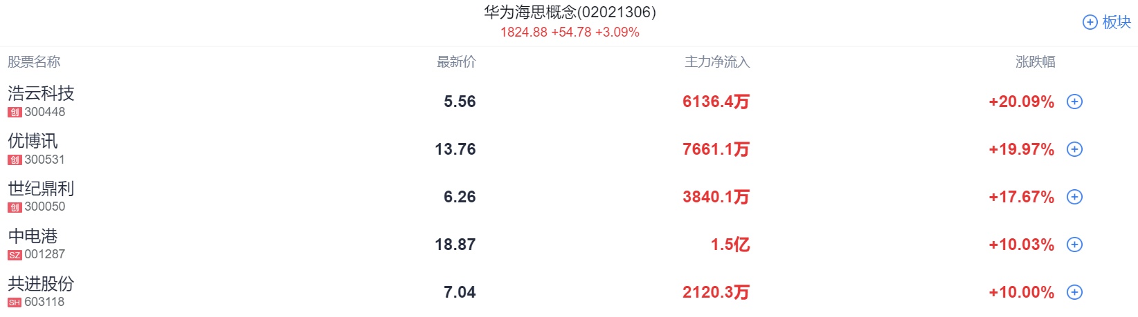 华为产业链走高,华为海思概念领涨,深圳华强7连板,优博讯20%涨停,共进股份涨停,中电港、力源信息、慧博云通、惠伦晶体、四川长虹等跟涨。