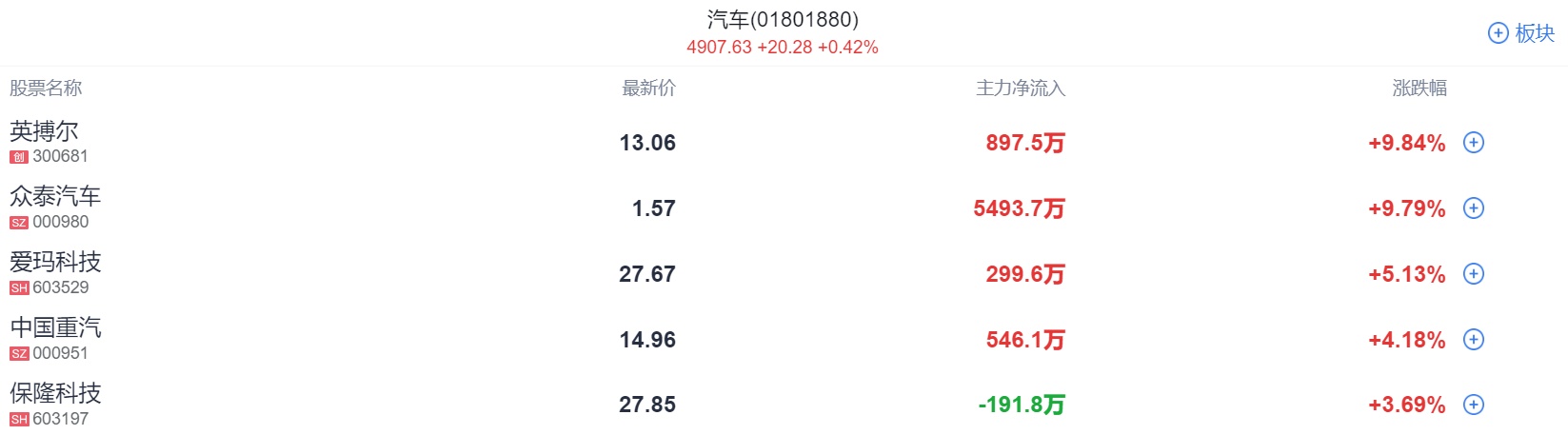 汽车整车板块异动拉升,众泰汽车触及涨停,赛力斯涨超5%,中国重汽、海马汽车、江淮汽车、上汽集团等上涨。