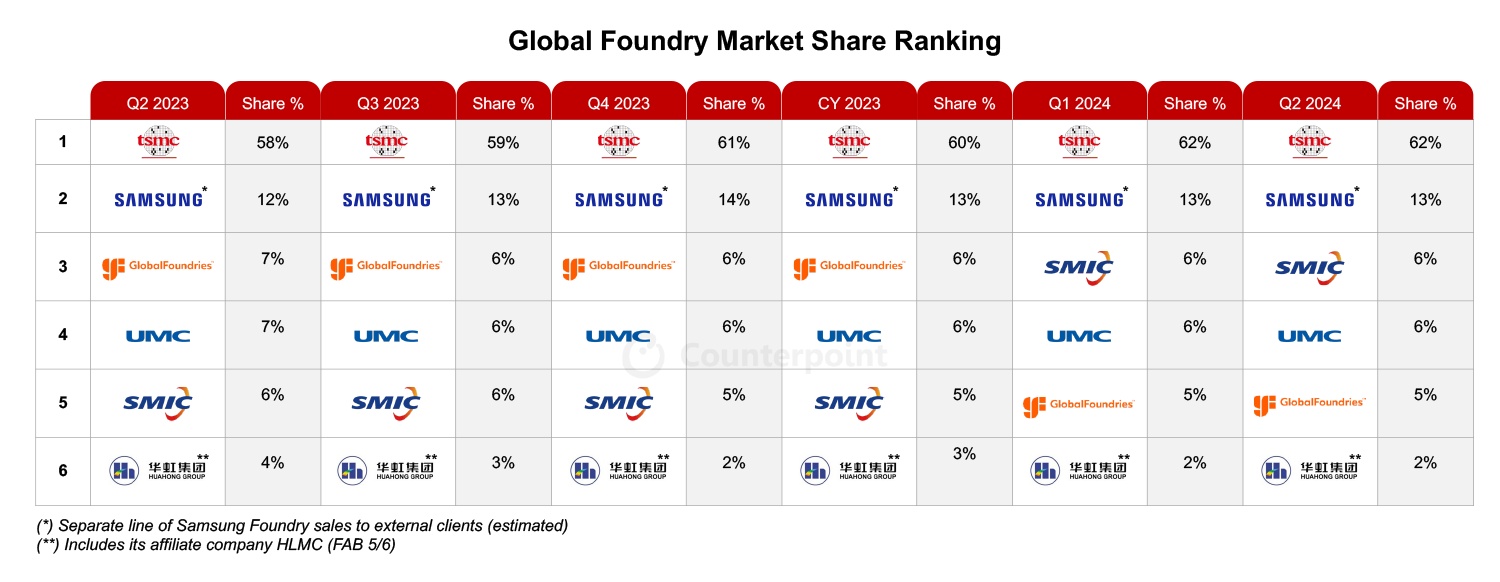 三星代工的收入顺序增长主要是由于智能手机的库存预建和补货,在2024年第二季度以13%的市场份额保持第二位。该公司继续专注于为先进节点争取更多的移动和AI/高性能计算客户,并预计其年度营收增长将超过行业增长。