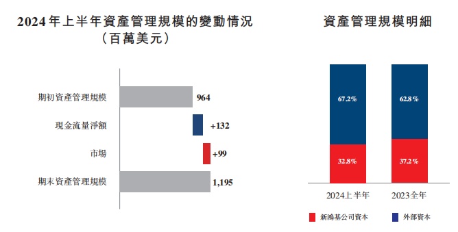 财报显示,截至2024年6月30日,资产管理规模为12亿美元,是新鸿基自2021年推出基金管理平台以来的新记录。期内资产管理规模增长得益于超过1.3亿美元的净现金流入和约1亿美元的市场收益,几乎所有投资策略均有良好贡献。总资产管理规模中,外部资本占67.2%,比2023年年底增加了4.4个百分点。数字是最好的试金石,随着资产管理规模的持续增长,基金管理业务有望为公司业绩增长提供新动力。