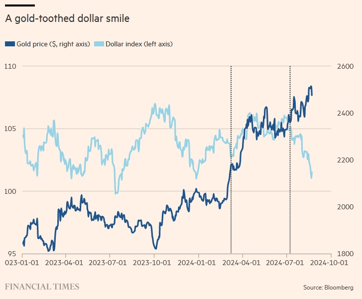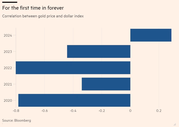 黄金和美元的同时上涨似乎是由一系列因素造成的。黄金今年以来的表现是历史上最好的一年,原因包括中国投资者需求上升、全球央行增加黄金储备、美国降息预期、地缘政治不确定性加剧、以及对冲基金的投机兴趣造成的。而美元走强的原因是,美国利率比其他国家维持在更高水平的时间更长。.