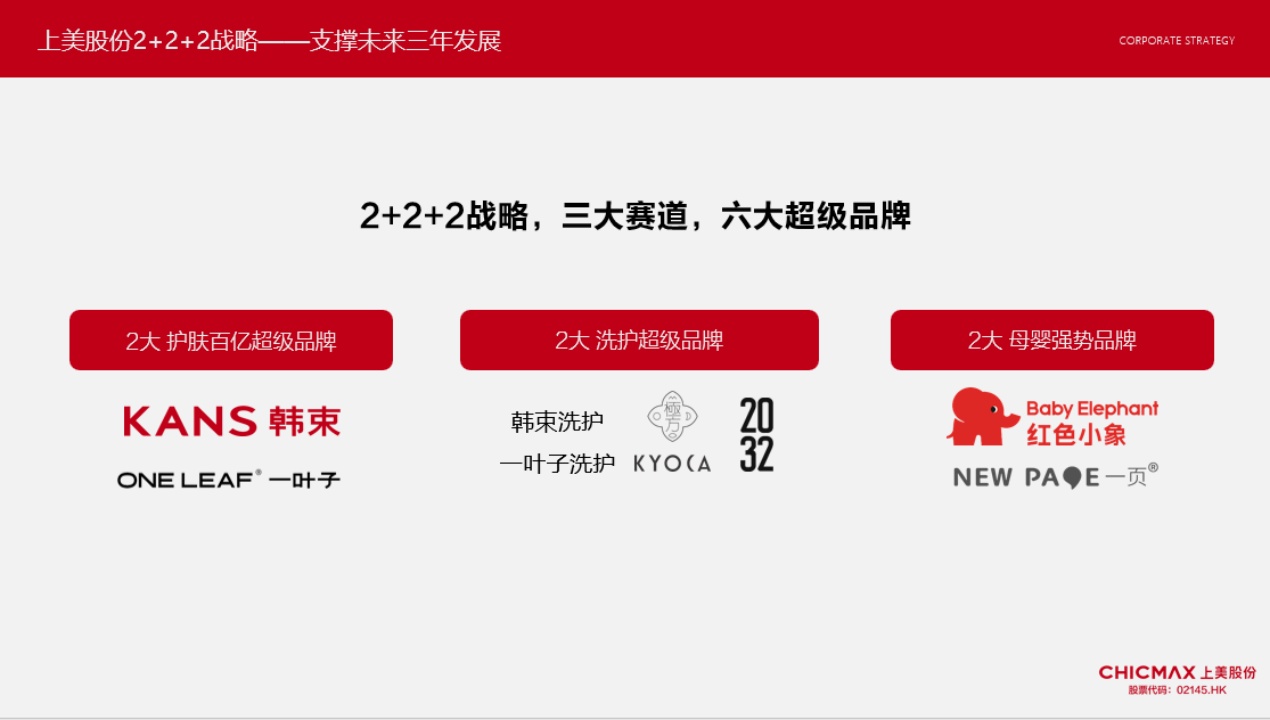 2023年,上美股份确立了“2+2+2 战略”“六六战略”,提出未来3年,公司将深耕护肤、洗护、母婴三大赛道,布局大众、中高端、高端价格带,成就2大护肤百亿超级品牌、2大母婴强势品牌、2大洗护超级品牌,提升公司穿越经济周期的发展韧性。