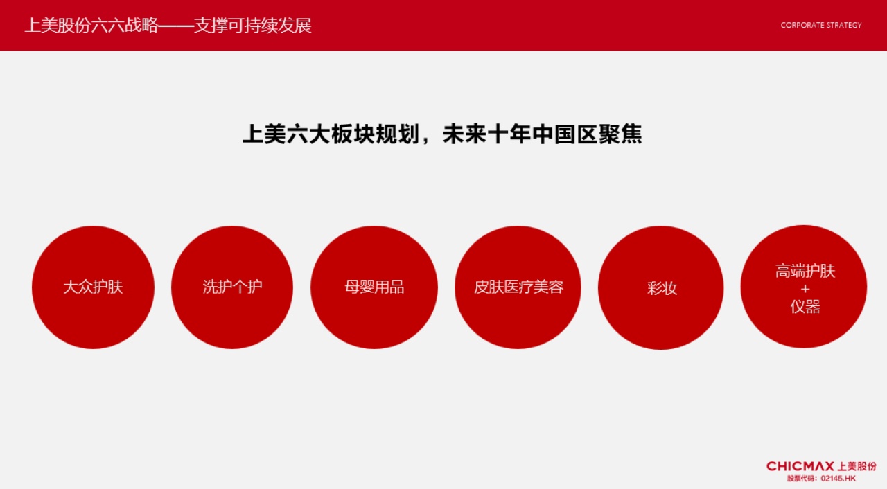 未来10年,公司在国内市场将聚焦大众护肤、洗护个护、母婴用品、皮肤医疗美容、彩妆、高端护肤+仪器六大板块,满足多元化消费需求,激发各品牌的高潜力和高势能,支撑公司长远、健康、可持续发展。