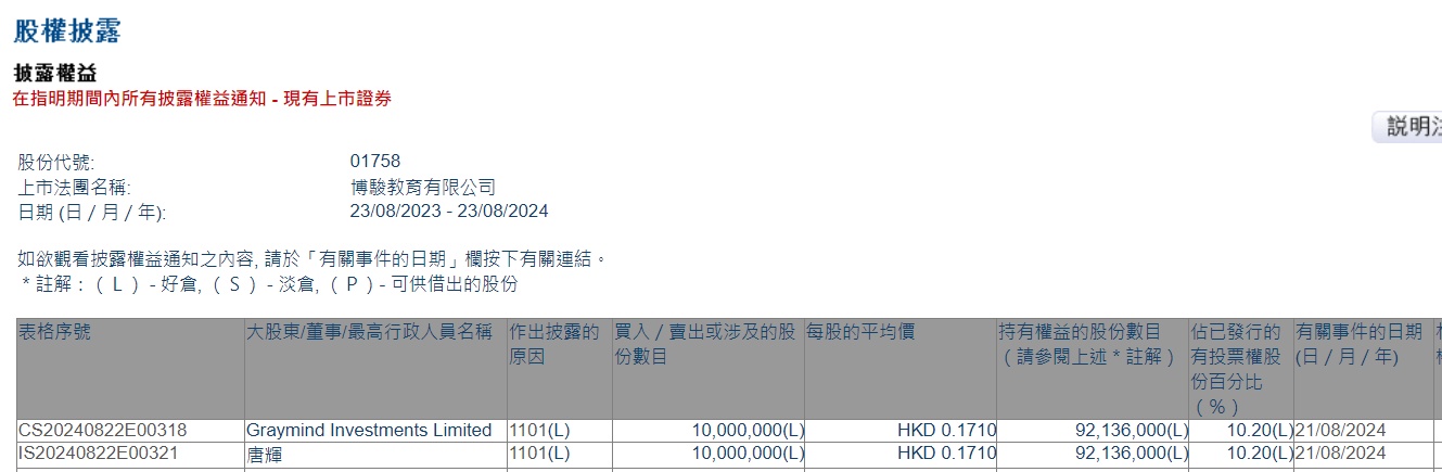 Limited增持博骏教育(01758)1000万股,每股作价0.171港元,总金额为171万港元。增持后最新持股数目约为9213.6万股,最新持股比例为10.2%。