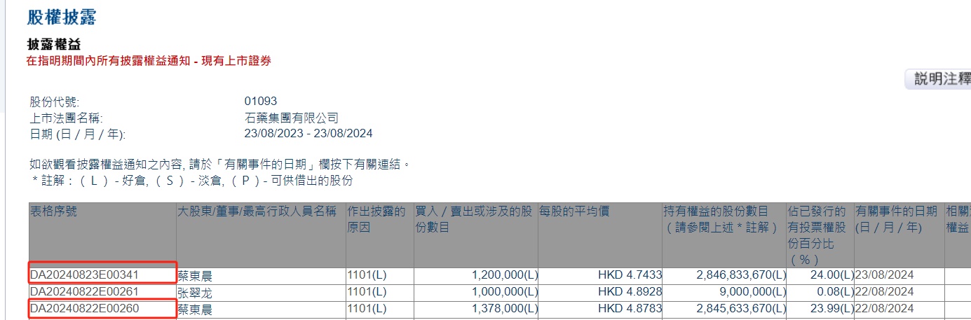 智通财经APP获悉,香港联交所最新资料显示,8月22、23日,主席兼执行董事蔡东晨分别增持石药集团(01093)137.8万股、120万股,合计257.8万股,每股作价分别为4.8783港元、4.7433港元,总金额约为1241.43万港元。增持后最新持股数目约为28.47亿股,最新持股比例为24%。