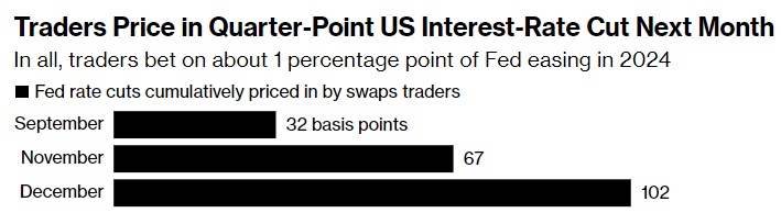 截至上周五,下一轮关于降息的重大押注已经成为焦点。交易员加大了对9月份降息50个基点的押注。而日益疲软的美元正成为新一波套利交易的首选货币,这些交易涉及用借来的钱进行高风险押注。
