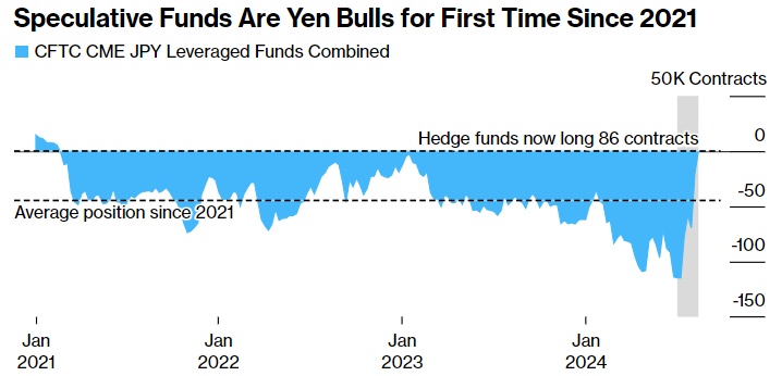 美国商品期货交易委员会数据显示,自2021年以来,对冲基金一直在期货和期权市场上看跌日元,随着日本央行的举措表明利率政策将发生历史性转变,在套息交易爆仓后,这些对冲基金开始看涨日元。