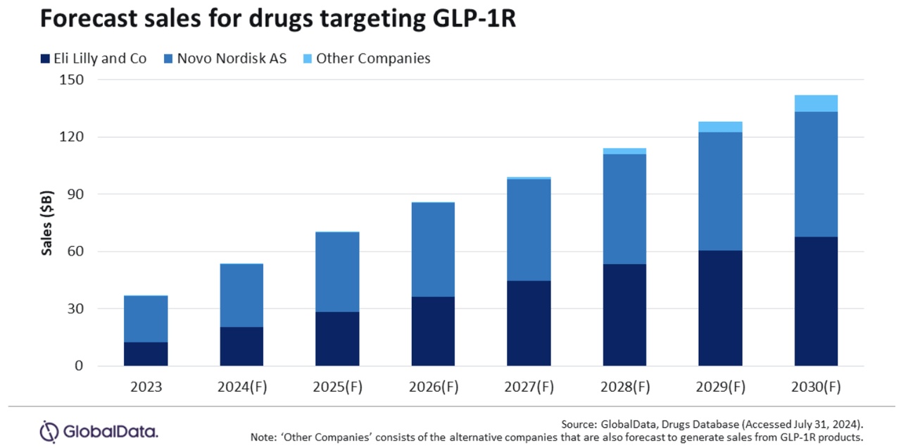 数据显示,2023年,诺和诺德和礼来旗下的GLP-1类减肥药物占据了该类药物总销量的99%。而根据GlobalData的数据,到2030年,尽管可能会有更多类似药物进入市场,但这一占比预计只会下降至94%。GlobalData预计,到2030年,将会有14家其他制药公司销售GLP-1类减肥药物,但这些公司的GLP-1类减肥药物销售额总计仅为88亿美元。