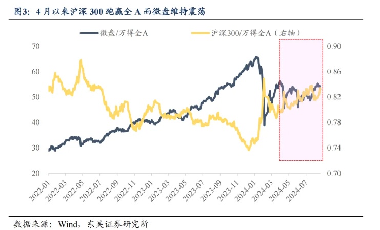 以指数周换手率(10周移动平均值,下同)观测资金交投活跃度,静态角度看,我们发现以机构为投资主体的沪深300交投活跃度目前处于近20年30%左右分位区间,而以活跃资金(包括部分杠杆资金、量化资金、游资、散户等,下同)为参与主体的万得微盘指数交投活跃度目前处于近20年70%左右分位区间,即活跃资金与机构资金的交投热情分化程度较为明显;但若动态来看,2021年“核心资产”松动后,市场风格不断向小市值倾斜,其中沪深300与微盘指数换手率之差自去年6月下旬起显著走扩;而今年4月中旬“新国九条”发布、引导市场扶优限劣、优化资源配置,大小市值的换手率差异趋势性收敛,目前已经回落至近20年75%左右位置,即活跃资金与机构资金交投活跃度的分化程度已经开始均值回归。对应到股价端体现为,过去2年持续跑输大盘的沪深300在4月以来获得稳定超额,而在过去2年中大幅跑赢全A的微盘指数则在近4个月内呈现出波动性收敛、相对大盘震荡运行的特征。