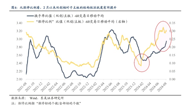 “涨停比例”(指涨停标的数量占板块全部标的数量的百分比,下同)可以反映出活跃资金寻找涨停机会的积极性,从局部展现市场的做多意愿。通过日频交易数据,我们发现双创与主板“涨停比例”(指涨停标的数量占板块全部标的数量的比例,下同)之比自2月上旬起震荡提升,并于7月起进入近3年相对高位区间波动;而双创与主板换手率之比自3月中旬开始向上修复,这可能意味着,从“涨停意愿”和“交投活跃度”看,双创板块均展现出较主板更为积极的边际变化。同时我们发现,尽管双创和全A指数仍在磨底,但双创板块的“涨停比例”已经率先企稳反弹,即在当前指数和流动性相对承压的情形下,资金依然愿意尝试寻找并参与结构性赚钱机会。