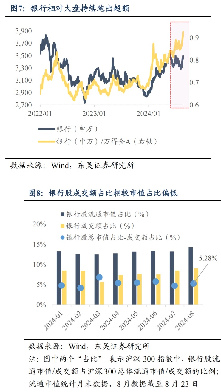 我们曾在6月30日报告《年初以来 ETF 流入的节奏、结构和对定价权的影响》中提到,ETF 资金是今年 A 股市场的重要增量资金,其“高抛低吸”的特征起到重要的“市场稳定器”作用,同时我们亦提出“若板块成交额占比明显低于市值占比,则少量资金就能对板块形成有效拉动”,而沪深300指数重仓的银行股满足上述特征,故ETF资金的流入是银行板块取得超额的重要因素。我们观察到,股权指数ETF净流入高峰发生在去年12月和今年1月,2月起其净流入规模一度收窄甚至转负;但6月起随着大盘的震荡整固,股权指数ETF再次开启大规模净流入(其中6/7/8月分别净流入62/109/53亿,8月数据截至8月23日), 四只代表性沪深300ETF基金重新持续异动放量,即指数型被动基金正在积极“做多”A股。同时我们观察到,在沪深300成分股中,近4个月银行股总市值占比高于流通市值占比的差值基本保持稳定,这意味着重仓银行股的被动基金的放量流入依然是银行板块相对全A持续跑出超额的原因之一。