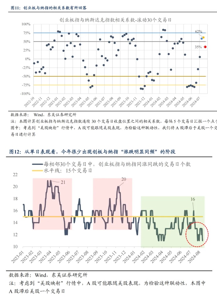 2022年末ChatGPT出圈后,A股以AI为代表的科技板块时常与美股以NV为代表的科技巨头表现出一定的联动特征,体现为“科技映射”行情的活跃。我们试图用两种方法衡量不同阶段A股与美股“涨跌同频”的程度:第一种方法是观察相邻30个交易日中,创业板指与纳指“同涨同跌”的交易日个数(将创业板指滞后一个交易日),发现二者联动性最强的阶段发生于2023年的4月和11月,而今年以来中、美科技股的“同涨同跌”现象并不明显,且8月以来进一步弱化;第二种方法是计算相邻30个交易日创业板指与纳指收盘价的相关系数(依然将创业板指滞后一个交易日),该数值波动性较大,曾在2023年2月与今年3月密集落在高于75%区间,7月下旬以来基本活跃在(-75%,+75%)区间内,相关性并不强。以上数据或表明,中美科技行情可能正在逐渐“脱敏”,目前A股以创业板为代表的科技板块受“美股映射”的影响趋弱,行情独立性有所提升。