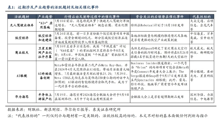 7月以来,尽管大盘并未放量,且“主题交易”属性较强的小市值指数整体处于跑输全A的状态,但市场中结构性交易热点并未“缺席”,在一系列产业事件的催化下,“无人驾驶出租车”、“低空经济”、“商业航天”,以及“AI眼镜”、“华为海思”等相继活跃表现,其背后折射的是资金对于前沿产业变化的密切关注与积极参与。如“萝卜快跑”走红的背后是“AI+”应用的落地与自动驾驶的商用机遇出现;低空经济投资项目密集申报备案,意味着部分区域低空经济的发展已逐渐由政策规划阶段步入项目落地阶段;“G60星座”首批组网卫星的成功发射拉开了我国卫星互联网产业化发展的序幕;“Ray-Ban”眼镜月活高增,其背后是AI终端交互设备的革新或已正在路上;华为海思将首次举行较大规模的“全联接大会”、被业内视为新品发布和加速的信号,折射出半导体上游环节的国产创新明显提速。我们认为上述题材的轮动活跃并不是一种单纯的“资金面炒作”行为,这一方面意味着指数存量震荡环境下,活跃资金主体正在积极寻找弹性机会,风险偏好并不弱;另一方面体现出投资者对于前沿产业趋势的高度关注和较强的参与意愿。