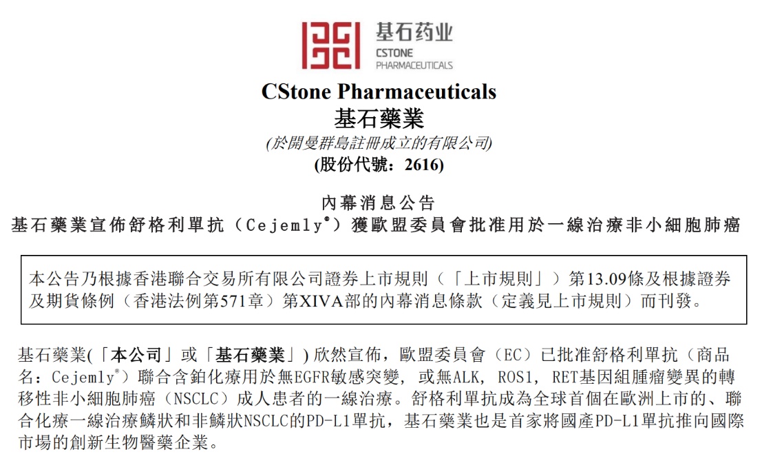 也就是说,舒格利单抗成为全球首个走出中国的抗PD-L1单抗,也成为全球首个在欧洲上市、不论PD-L1表达水平、且同时覆盖一线鳞状和非鳞状NSCLC的抗PD-L1单抗。而基石药业也成为首家将国产PD-L1单抗推向国际市场的创新生物医药企业。