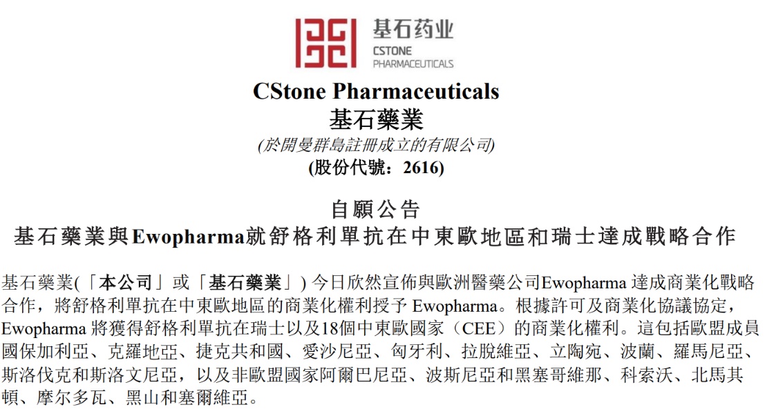 实际上,早在此前基石药业便对舒格利单抗在欧盟顺利获批上市充满信心。今年5月27日,基石药业便宣布与欧洲医药公司Ewopharma 达成商业化战略合作,将舒格利单抗在瑞士及中东欧地区的商业化权利授予 Ewopharma。此外根据合作协议,除了后续的产品销售收入外,基石药业还将最高获得5130万美元(约相当于3.5亿人民币)的首付款以及后续注册和销售里程碑付款。