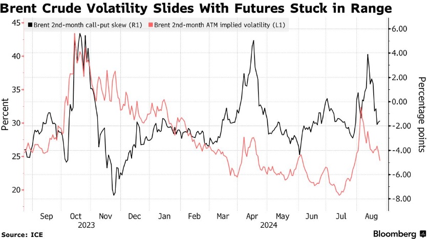 第二个月合约的隐含波动率上周五跌至7月29日以来最低,与几周前触及的六个月高位形成鲜明对比。与此同时,上周五尾盘看跌期权偏度(即买方为防止价格下跌而支付的溢价)扩大至去年12月以来最大。