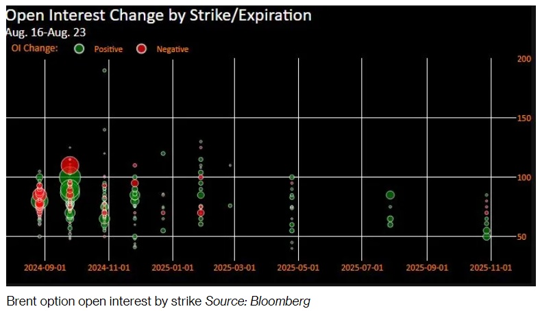 有一些迹象表明近期供应紧张。在过去的两个月里,美国的石油库存下降了近3500万桶。过去一周,期权未平仓合约数量增幅最大的是11月份看涨期权,行权价格上限从80美元到100美元。