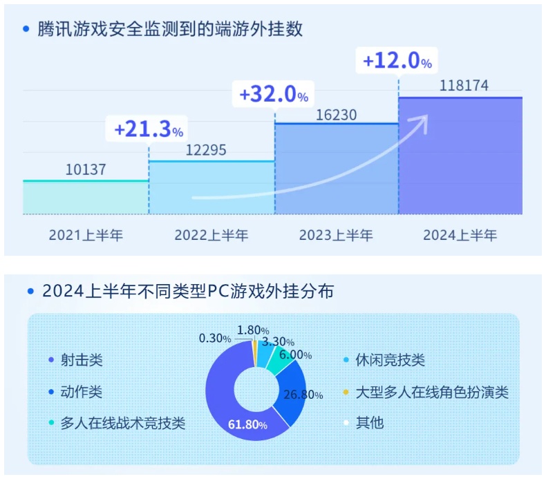 2024年上半年,腾讯游戏安全监测到的移动游戏外挂数同比2023年上半年,增长了14%,为335387款,相比于2023年上半年的大幅上涨,今年上半年移动游戏外挂的上涨幅度相对放缓,但外挂数量仍达到了历年之最。移动游戏外挂主要集中在射击类游戏(FPS+TPS)和多人在线技术竞技类游戏(MOBA)上。