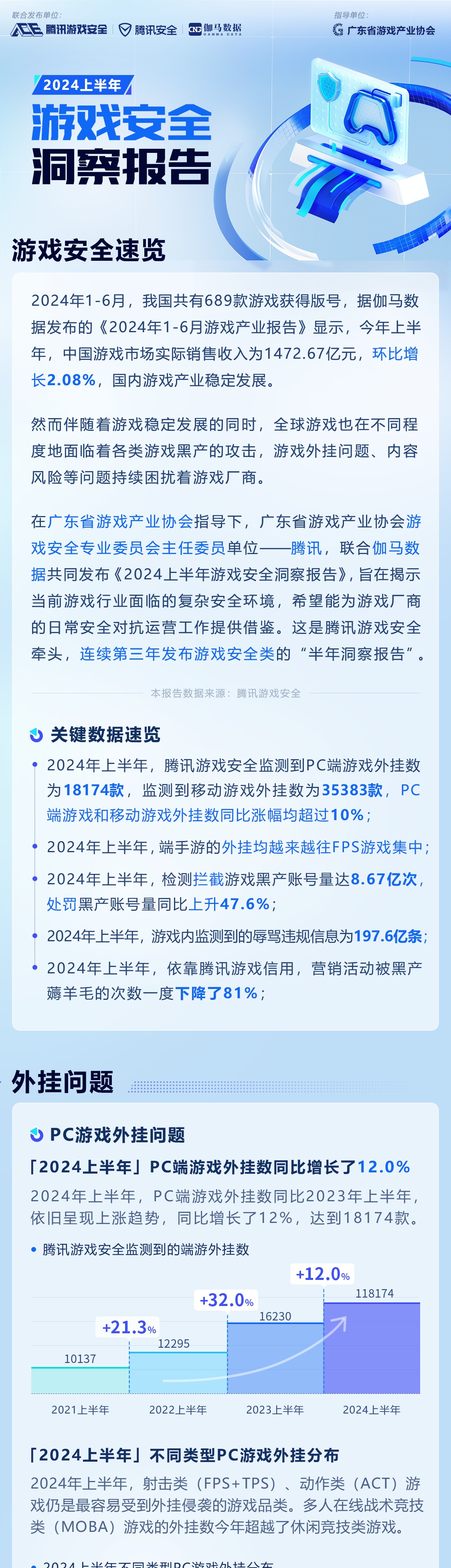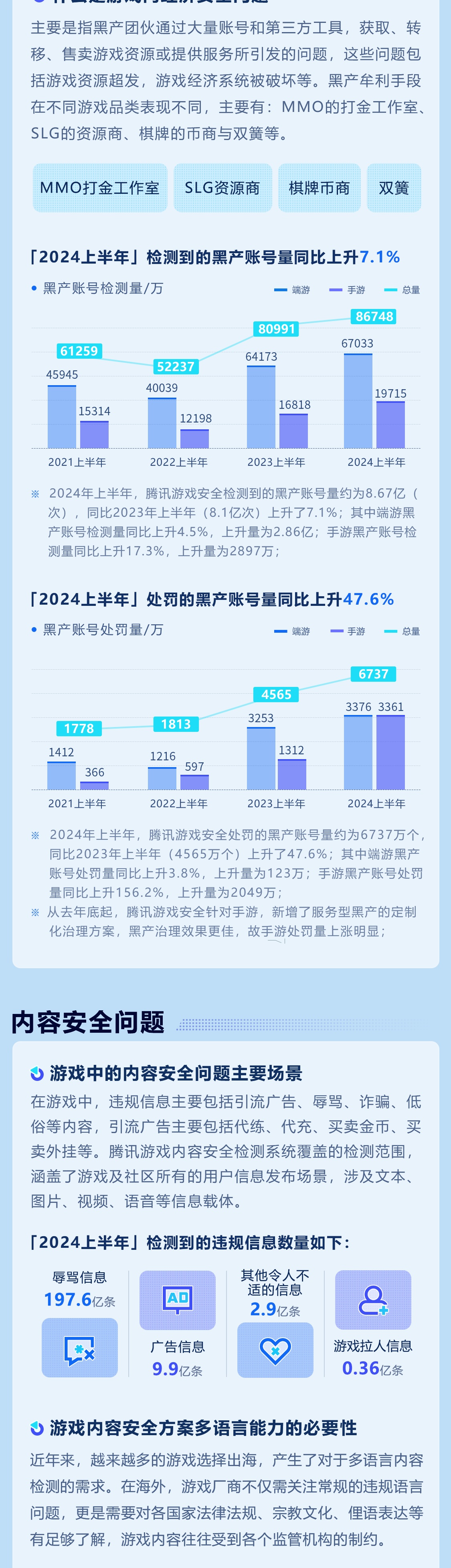 游戏黑产账号主要通过一些违规脚本在游戏进行各类违规行为,破坏游戏的平衡性。据腾讯游戏安全统计,2024年上半年,检测到的黑产帐号量超过8.67亿次,同比上升7.1%。